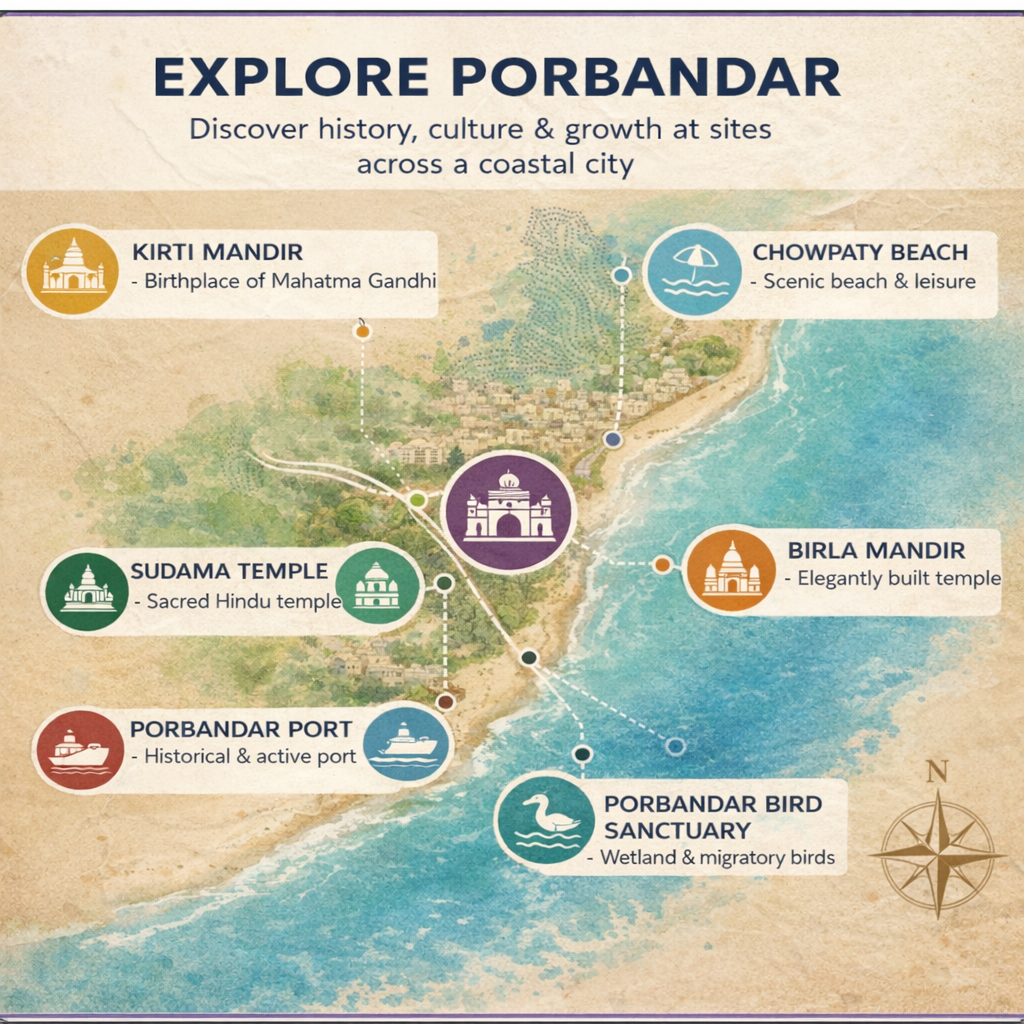 Key Landmarks: Kirti Mandir (birthplace of Mahatma Gandhi), Sudama Mandir, Porbandar Beach & Chowpati, Bharat Mandir, Huzoor Palace, and Barda Hills Wildlife Sanctuary (nearby).